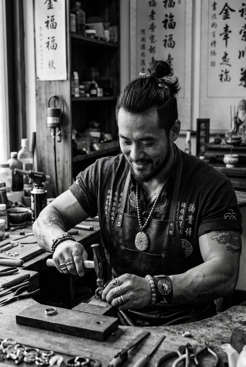 He is a student of Taoism, a keeper of BaZi, a reader of the Five Elements. He does not design. He discerns. He studies the stone’s origin, its elemental nature, its quiet conversation with the earth. He consults the cycles of Wood, Fire, Earth, Metal, and Water. He asks: What does this stone seek? Who is meant to hold it? What intention is it already carrying?
